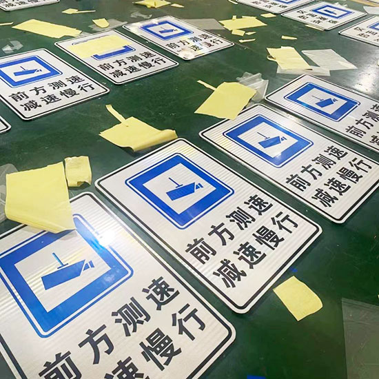 前方測速減速慢行指示牌制作鋁板發(fā)光膜導視牌生產(chǎn)青島路牌制作,道路指示牌材質(zhì)中,性價比最高的通常是鋁合金?。